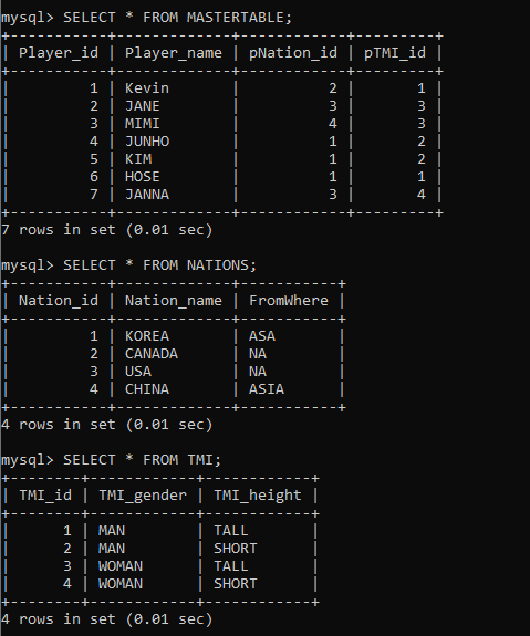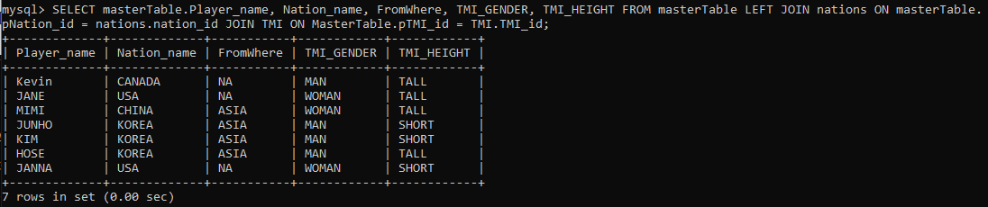 SELECT masterTable.Player_name, Nation_name, FromWhere, TMI_GENDER, TMI_HEIGHT FROM masterTable