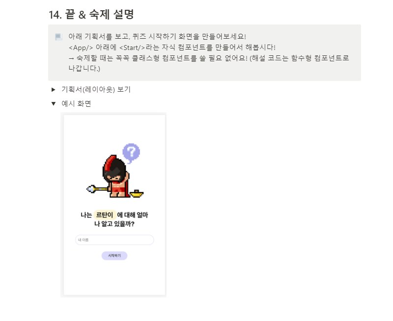 뭔가 Layout만 하기에는 심심할거 같아서 useRef()를 통해서 input 값을 동적으로 name에 줘봤다. 다만 input창을 초기화 시키는 방법을 실패했다. 막장의 소스코드는 아래있다 app.js and start.jsx 더보기 // app. js import React, {useState, useRef} from "react"; import styled from "styled-components"; // styled component // components import Start from './Start.jsx' import img from "./scc_img01.png"; function App() { const [name, setName] = useState('르탄이'); // name에..