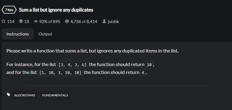 이번 문제는, 리스트내의 모든 엘리먼트를 더해야한다, 단 중복되는 숫자가 있으면 그 숫자는 피해야 한다.