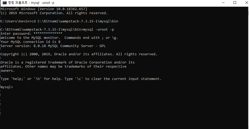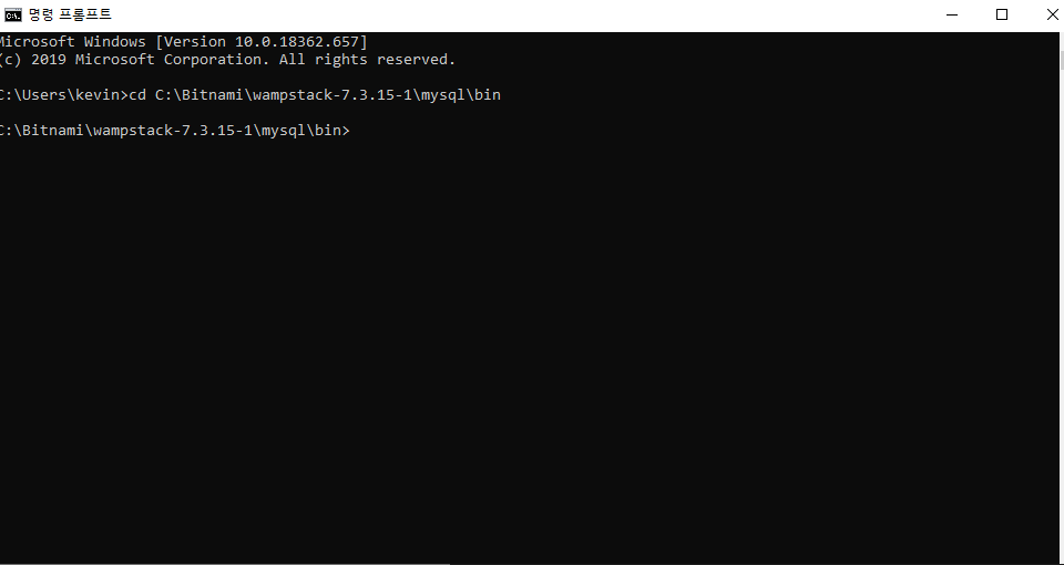 C:\Bitnami\wampstack-7.3.15-1\mysql\bin 여기까지 들어가 줍니다.(mysql폴더안에 bin 폴더까지)