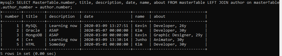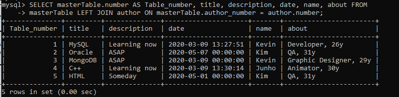 SELECT masterTable.number, title, description, date, name, about FROM masterTable