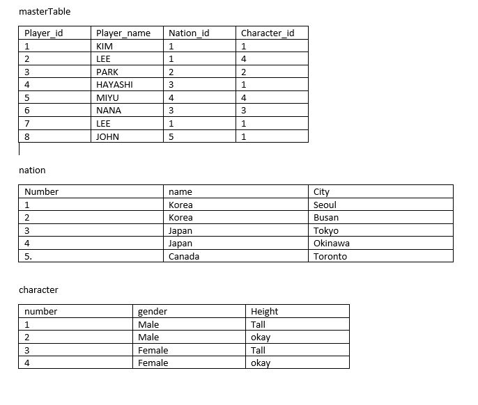3개의 테이블을 JOIN하는 연습을 하겠습니다. 이 3개의 테이블들 합치고, 숫자들 대신 정보들을 join시켜서 읽어보도록 하겠습니다. 이러한 테이블을 만들고, 중복되는 정보들을 따로 테이블로 빼서 관리하겠습니다. player_nation, player_tmi에 겹치는 정보가 여럿 있으니, 각각 테이블을 하나씩 만들어 주면 되겠네요. 일단 데이터베이스를 만들고(스키마), 테이블들을 만들겠습니다. CREATE DATABASE EXAMPLE_01; 그리고 이제 테이블을 만듭니다. CREATE TABLE MasterTable( -> Player_id INT NOT NULL AUTO_INCREMENT, -> Player_name VARCHAR(100) NOT NULL, -> Player_nation VARCHA..
